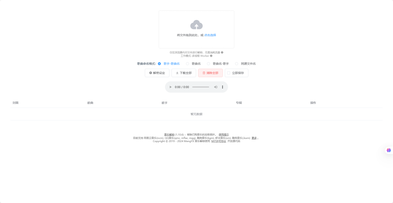 - QQ 音乐 (.qmc0/.qmc2/.qmc3/.qmcflac/.qmcogg/.tkm)